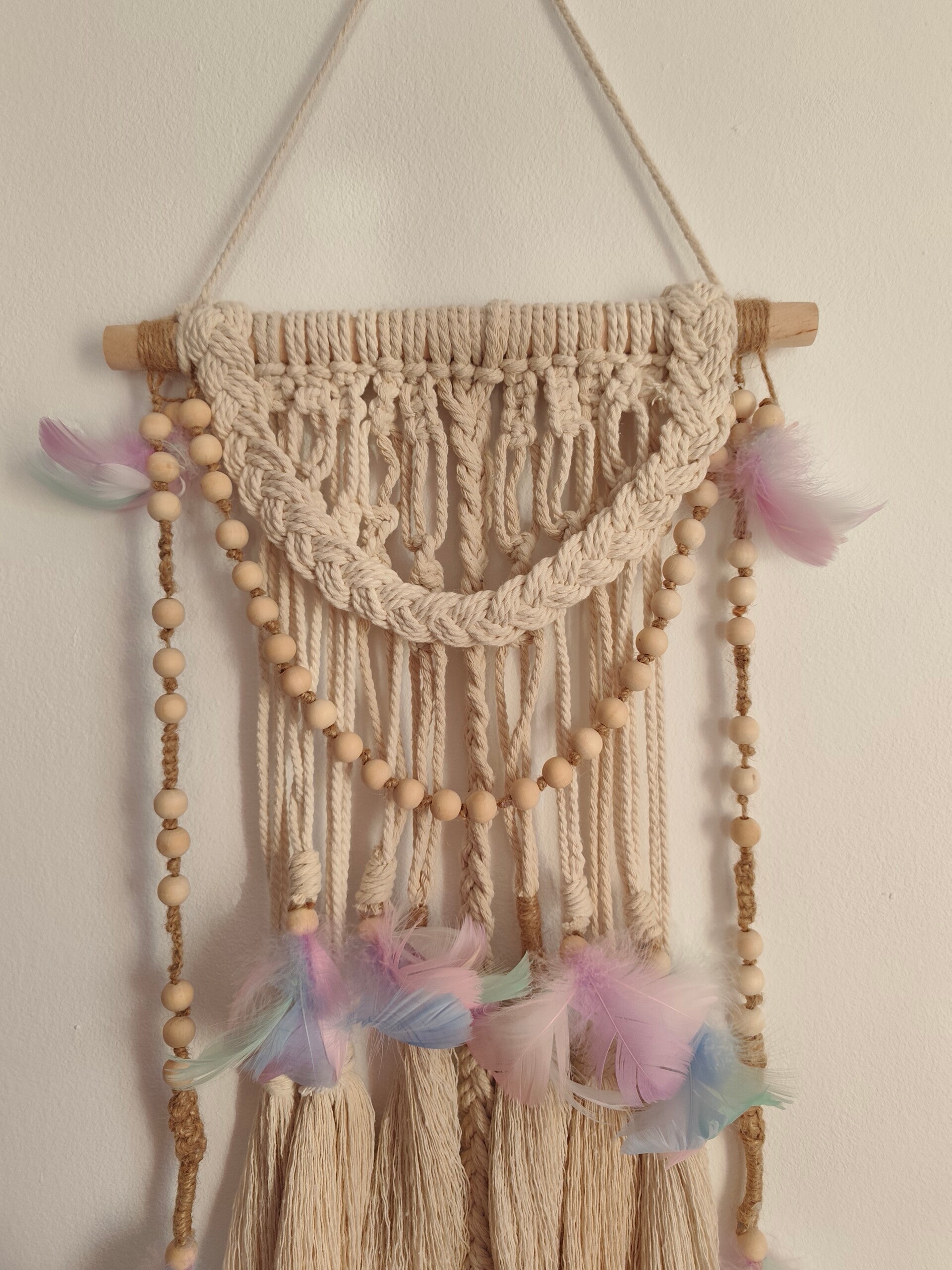 Añade un toque suavee, bohemio y artesanal a cualquier espacio con este precioso tapiz hecho totalmente a mano. Combina cuerdas de algodón 100% natural con cuentas de madera y delicadas plumas en tonos pastel, creando una pieza ligera y armoniosa que transforma cualquier pared.